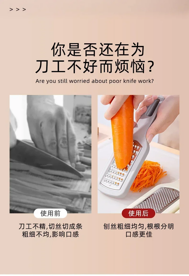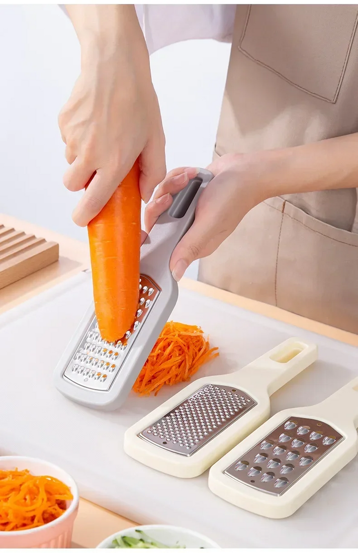 Efficiently prepare your produce with our 3-in-1 vegetable cutter, mandoline slicer, and potato peeler. The added carrot grater feature allows for more versatility and convenience in your kitchen. Save time and effort with this multifunctional tool.