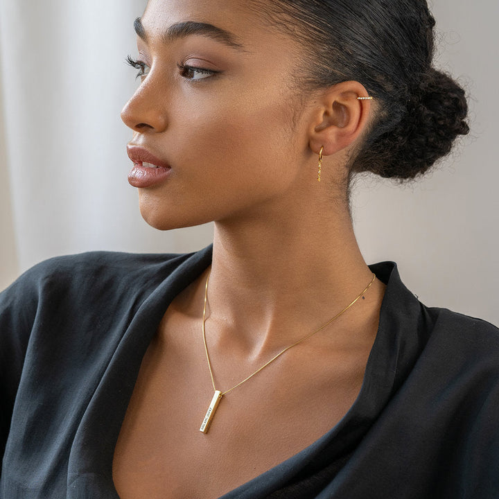 This custom name bar necklace is made with 18K Gold Plating for a warm, glowing aesthetic. The pendant hangs from a closed chain, providing effortless, chic appeal.