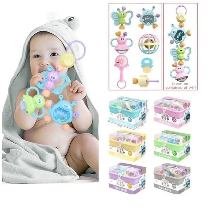 Baby Rattle Set: The centerpiece of this collection is a set of charming baby rattles. These carefully designed rattles are ergonomically shaped for tiny hands, providing auditory stimulation with gentle sounds that capture a baby's attention and encourage grasping.