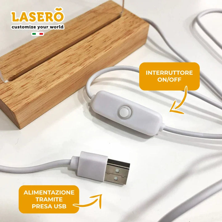 This personalized lamp is a unique blend of warmth and modernity, designed to illuminate not only spaces but also hearts. Its natural wood base offers a rustic and elegant touch, while the warm white LED strip provides cozy and relaxing illumination. Powered by a USB cable, it is ready to shine wherever you want to bring a little light.