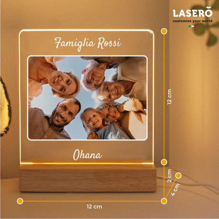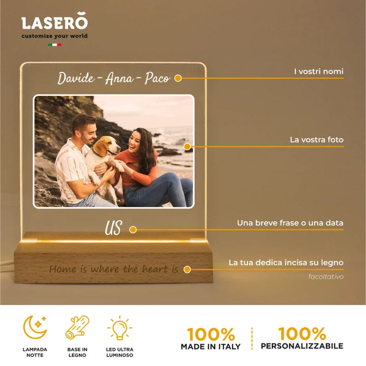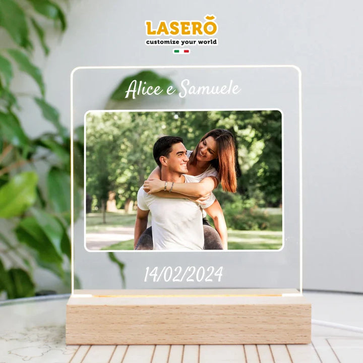 The custom photo light is a unique product that gives you the opportunity to choose a photo to print in the rectangle shape and to personalize the photo lamp with your names and a dedication to print on the plexiglass and another to engrave on the wooden base. Choose the photo of your most precious memories, send it to us and we'll take care of the rest.