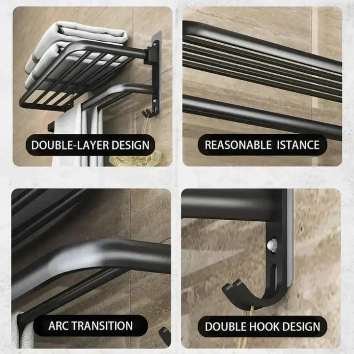 Maximize space in your bathroom with our DOUBLE LAYERS FOLDING BATH TOWEL HOLDER. With its unique design, it allows for easy storage and organization of your towels. Made with high-quality materials, it is sturdy and durable. Perfect for any bathroom, it's the perfect addition to your daily routine.