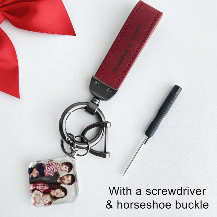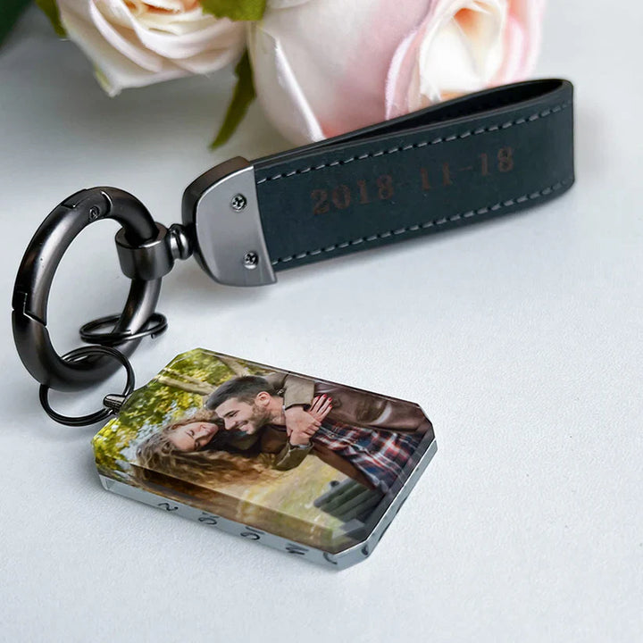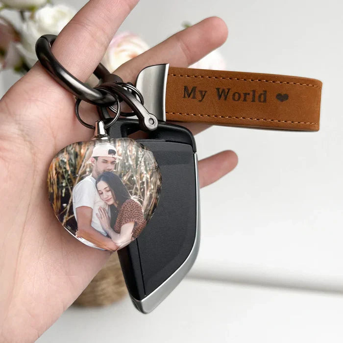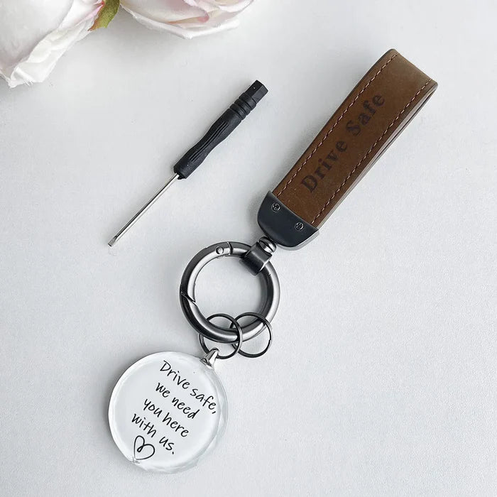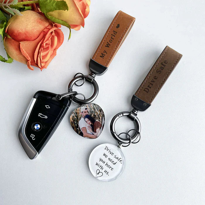 Introducing the "Drive Safe My Love" Personalized Laser Engraved Leather Crystal Photo Keychain—a heartfelt keepsake that blends elegance and sentimentality. Crafted from high-quality leather and adorned with a sparkling crystal, this keychain is designed to remind your loved ones to drive safely every time they hit the road.