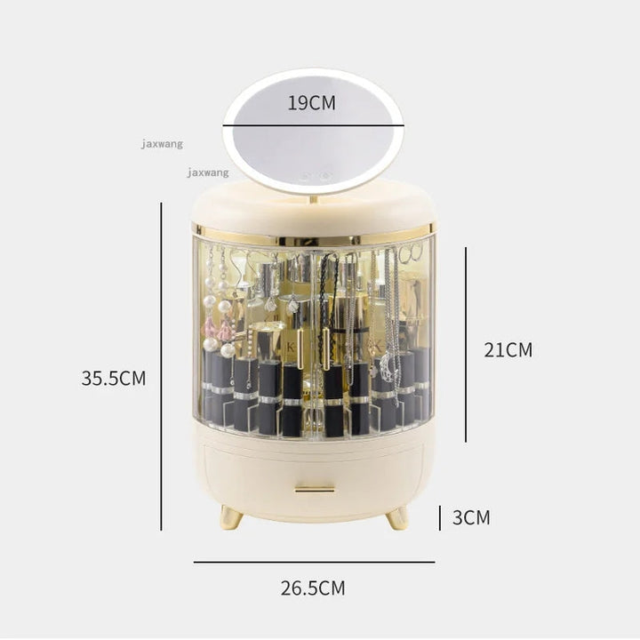 This cosmetic organizer features dual doors and an LED mirror for efficient and organized makeup storage. The built-in mirror adds convenient functionality for everyday use. Keep your cosmetics in one place and easily accessible with this sleek organizer.