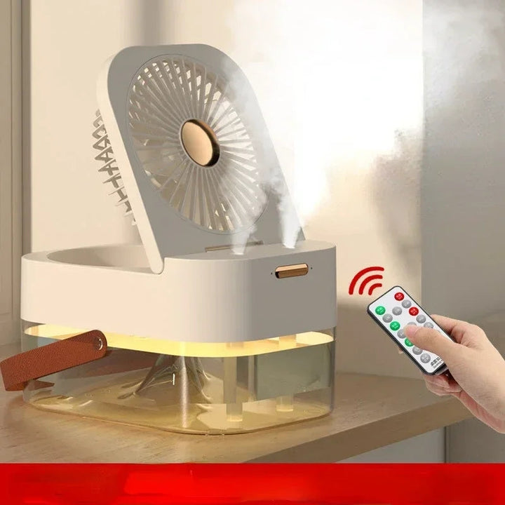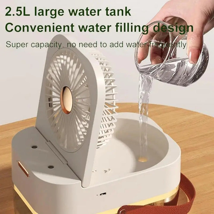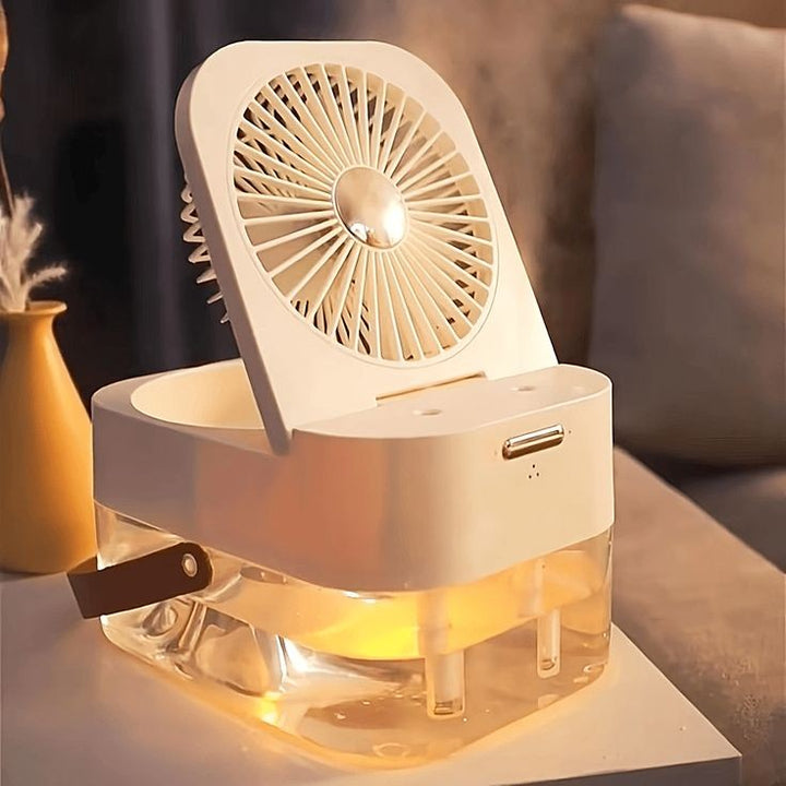 This dual sprayer portable humidifier fan with lamp combines the benefits of a humidifier, fan, and lamp in one compact device. The humidifier helps improve air quality and reduce dryness, the fan provides a cool breeze, and the lamp provides additional light. All in one convenient and portable package.