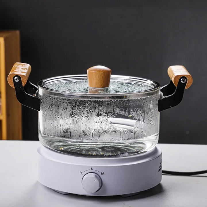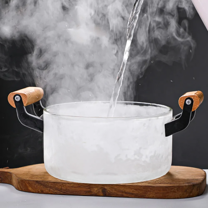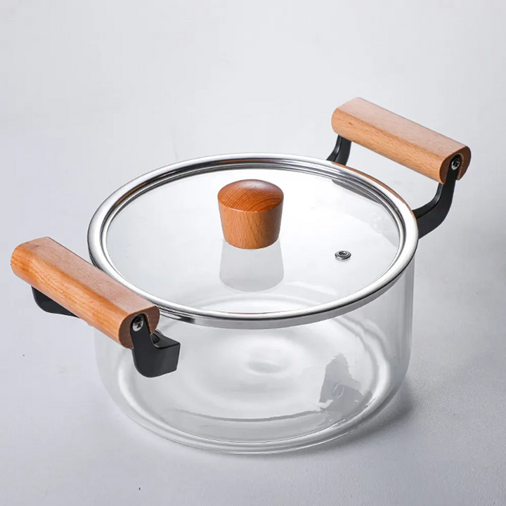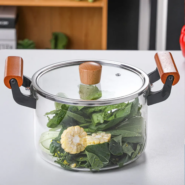 HEAT-RESISTANT STOCK POT WITH WOODEN HANDLE CLEAR LID SPACIOUS DESIGN