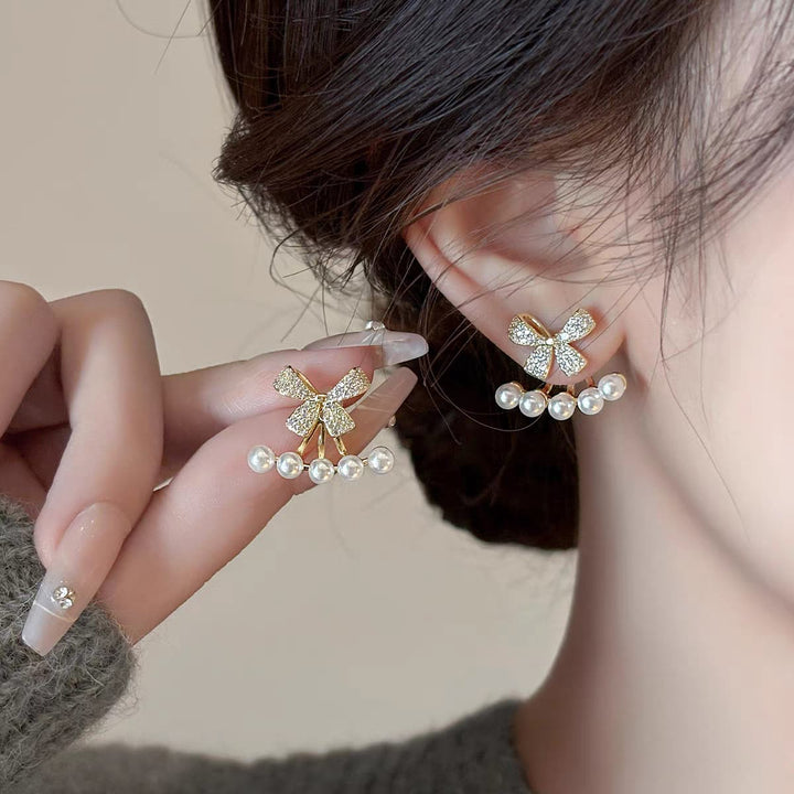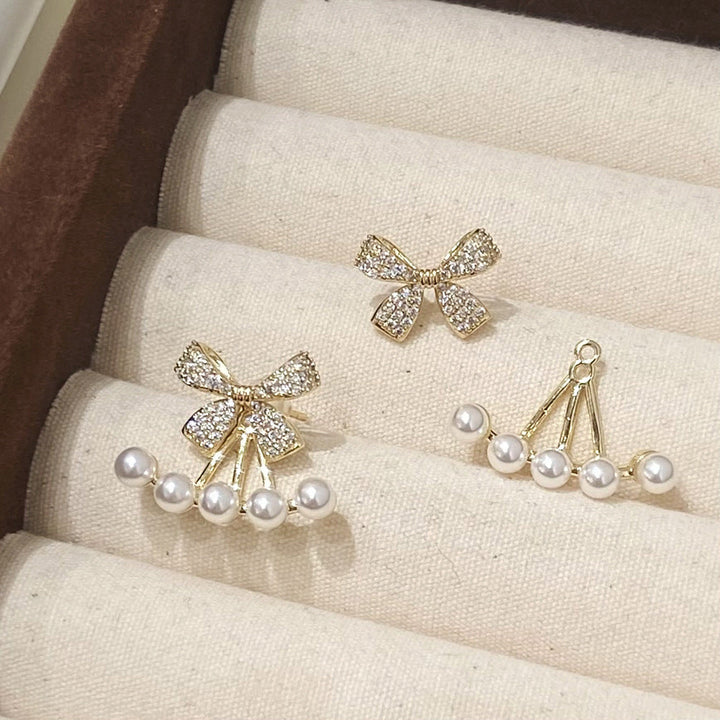Indulge in elegance with our Korean luxury zircon bow stud earrings for women. Featuring a stunning pearl bow knot design, these earrings add a touch of sophistication to any outfit. Made with high-quality materials, our earrings are both durable and stylish. Elevate your jewelry collection with these timeless gems.