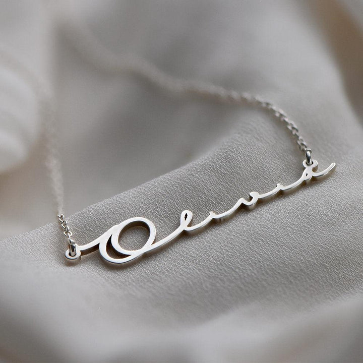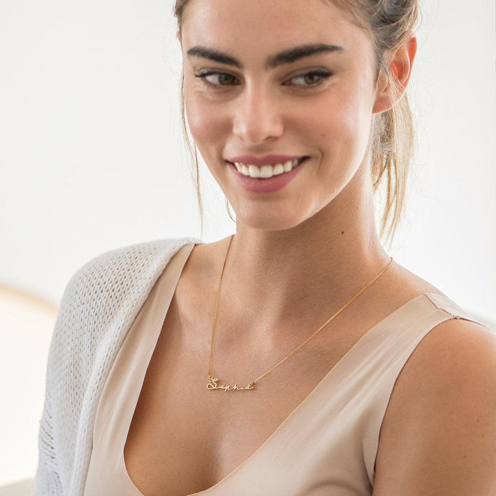 Sleek and simple, our gold-plated Mon Petit Name Necklace is the perfect piece for creating an effortless signature look that works well with your favorite styles. A cable chain attaches to each side of the pendant, which is rendered in a delicate script that looks just amazing next to your skin.