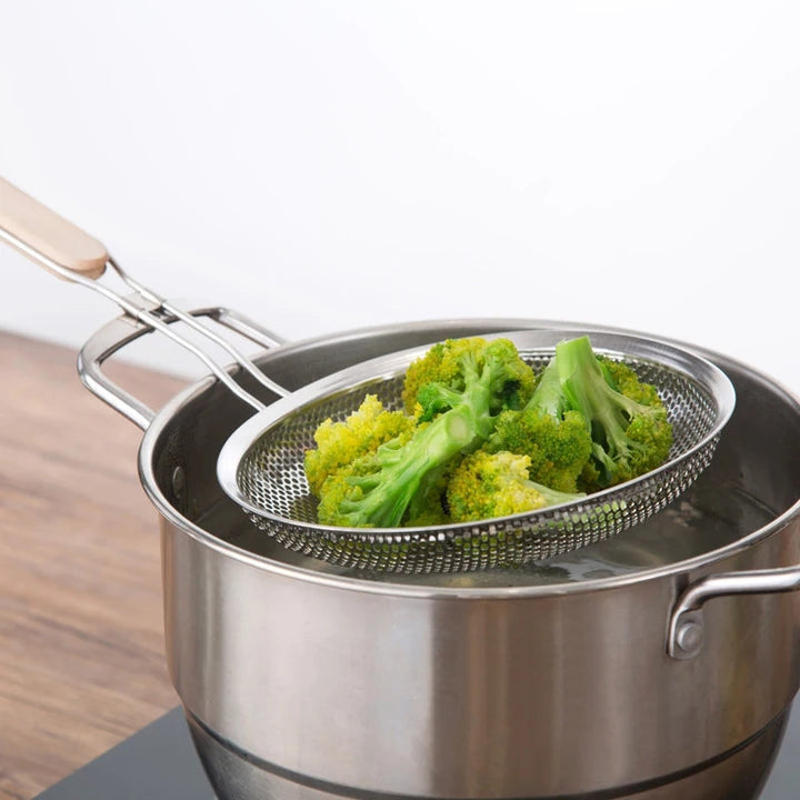 Crafted from durable stainless steel, this pack of 3 strainers with wooden handles is a must-have for any kitchen. The fine mesh design ensures efficient straining and the sturdy wooden handle allows for a comfortable grip. Perfect for effortlessly filtering grains, pasta, and more. Upgrade your cooking experience today.