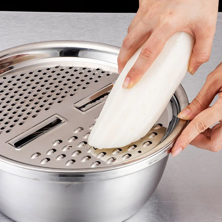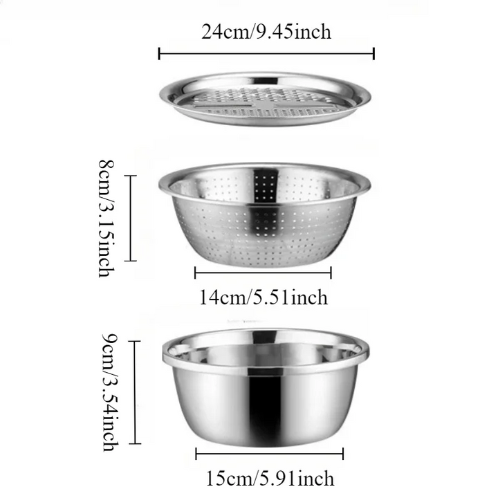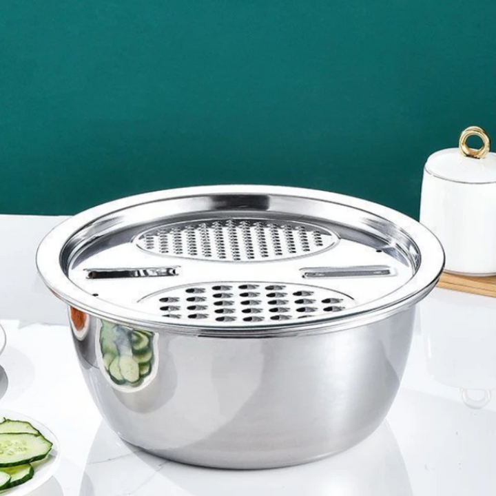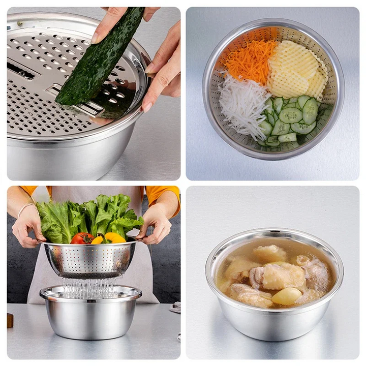 Effortlessly slice, grind, and drain with this versatile 4-in-1 stainless steel tool set. Ideal for vegetables, fruits, rice, and more. Save time and achieve perfect results with precision cutting and easy clean-up. Upgrade your kitchen with this essential multi-purpose slicer.